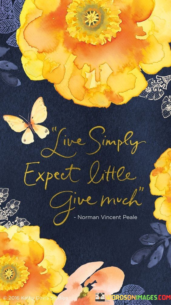 The quote "Live Simply, Expect Little, Give Much" encapsulates a philosophy of life that encourages a humble and selfless approach to living. It suggests that true fulfillment can be found by embracing simplicity, maintaining modest expectations for oneself, and being generous in giving to others.