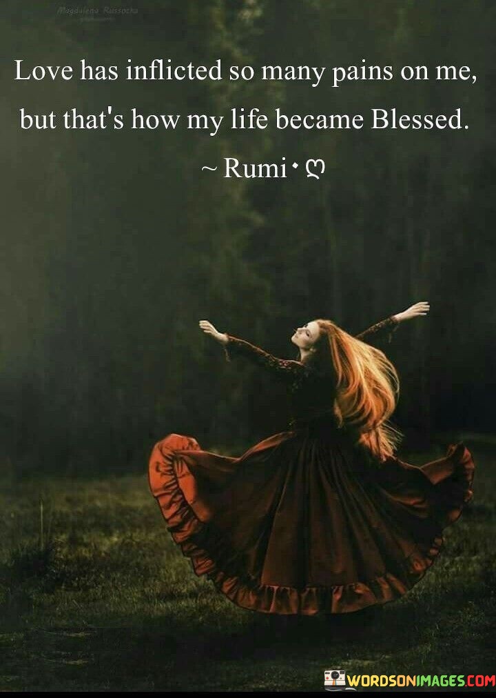 This quote reflects on the paradoxical nature of love, acknowledging the pain it can bring while recognizing the blessings it bestows."Love has inflicted so many pains on me" acknowledges the challenges and hardships that love can bring, including heartbreak and emotional turmoil.