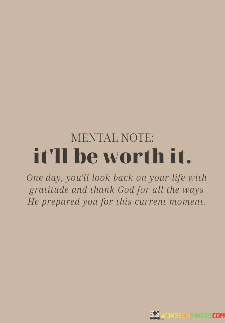 The quote "Mental Note: It'll be worth it" is a self-reminder or affirmation that suggests the speaker is acknowledging a challenging or demanding situation and believes that the effort and perseverance they are putting into it will ultimately yield valuable and rewarding results.