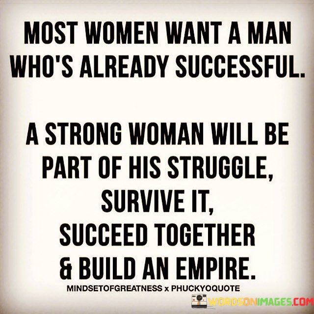 This quote beautifully encapsulates the qualities that a strong woman seeks in a partner and emphasizes the importance of mutual support, resilience, and shared aspirations in a relationship. In just a few words, it conveys a powerful message about the dynamics of a successful partnership. The quote starts by acknowledging the common desire of many women to be with a man who is already successful. It recognizes that financial stability and achievements can be attractive qualities. However, it swiftly shifts the focus to the remarkable strength of a woman who is willing to stand by her partner during his struggle. The quote highlights the value of a woman who is not solely interested in reaping the rewards of her partner's success but is ready to face challenges alongside him, providing support and encouragement throughout the journey. It underscores the importance of resilience and the belief that true strength lies in weathering the storms of life together, emerging stronger and more accomplished as a unit. The phrase "survive it, succeed together" encapsulates the idea of a shared journey, where both partners actively contribute to overcoming obstacles, achieving goals, and realizing their dreams. Moreover, the quote introduces the concept of building an empire, signifying the creation of something substantial and meaningful through joint efforts. It suggests that a strong woman seeks a partner with whom she can forge a powerful and lasting legacy, not just in terms of material success, but also in terms of personal growth, mutual support, and a shared vision for the future. Ultimately, this quote celebrates the strength and resilience of women who choose to be part of their partner's struggles, emphasizing the significance of collaboration, perseverance, and shared aspirations in building a strong and prosperous relationship.