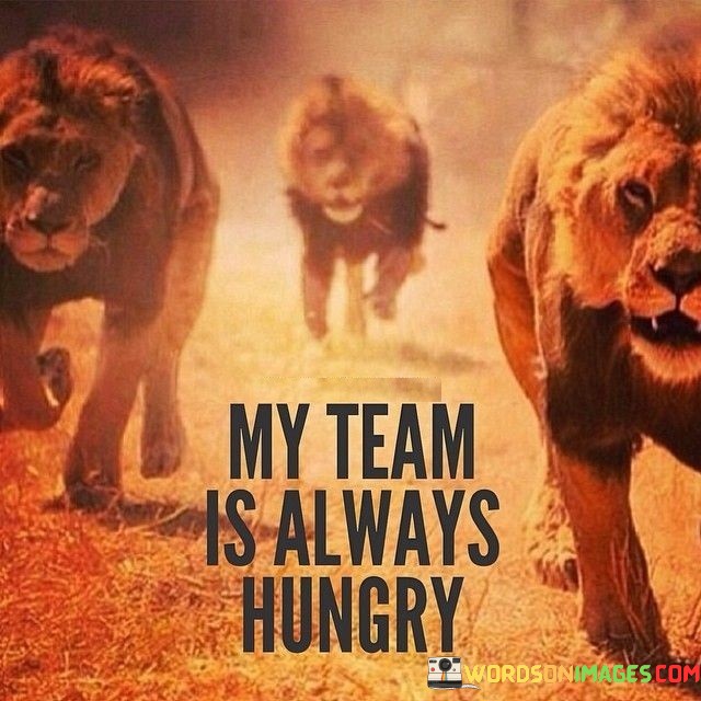 "My team is always hungry" reflects a group of individuals who possess an insatiable drive for success. Just as a lion in the wild relentlessly pursues its prey, this team is relentless in their pursuit of their goals and ambitions. Their hunger symbolizes a burning desire to achieve, improve, and excel.