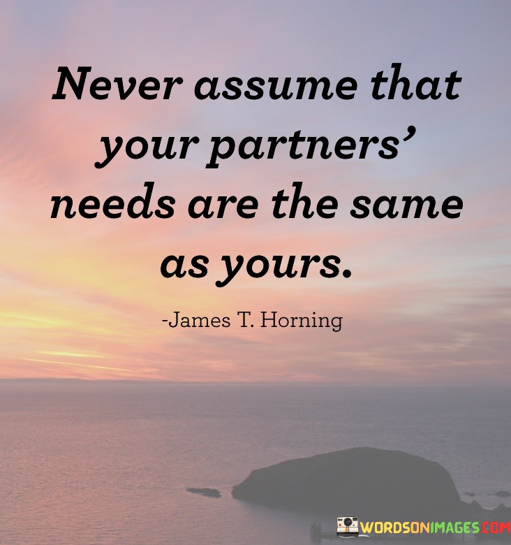 In the quote, "Never Assume That Your Partner's Needs Are the Same as Yours," the emphasis is on the potential differences in needs, desires, and perspectives between individuals in a relationship.