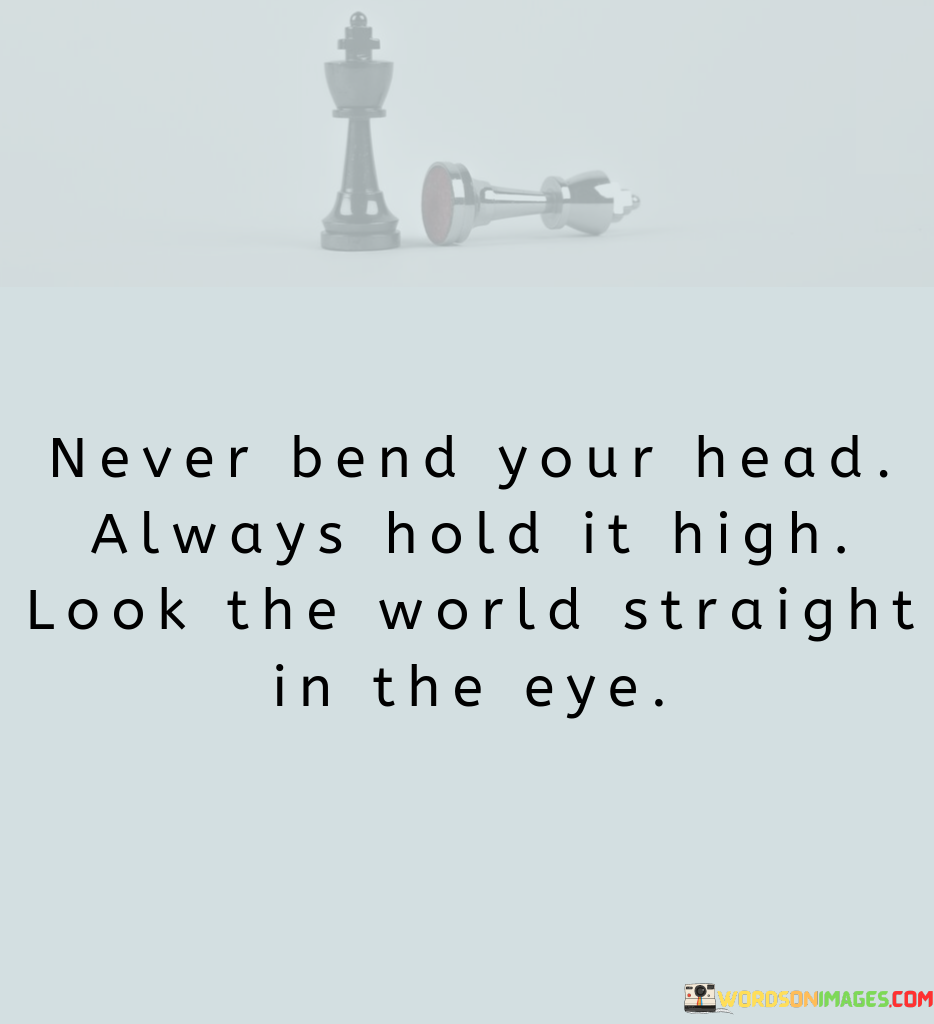 The phrase suggests that individuals should maintain a posture of confidence and pride, avoiding the act of bowing down or feeling inferior. It emphasizes the importance of facing the world with courage and self-respect.