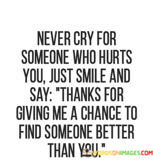The quote advocates resilience in the face of pain. "Never cry for someone who hurts you" suggests emotional strength. "Smile and say thanks" reflects grace in response. The quote encourages turning adversity into an opportunity for personal growth.