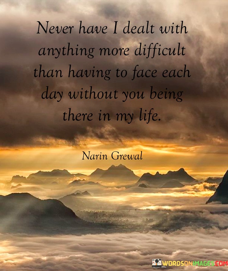 The quote expresses the profound sense of loss. "Dealt with anything more difficult" implies great emotional challenge. "Without you being there in my life" signifies the void left by the absence. The quote conveys the immense difficulty of coping with the daily absence of someone dearly missed.