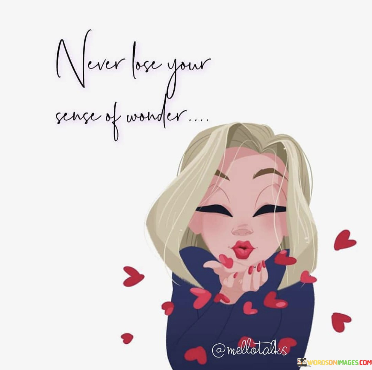 The quote "Never Lose Your Sense Of Wonder" encourages us to maintain the childlike curiosity and awe we often feel when encountering new experiences or the beauty of the world. It's a reminder to stay open to the magic and mystery of life, even as we grow older and more accustomed to the routines of adulthood. This sense of wonder can enrich our lives, making us more appreciative, creative, and open to learning.