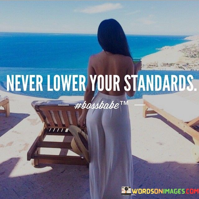 This quote advises us to always maintain our high expectations and not settle for less. Imagine your standards as a lighthouse guiding your ship safely through life's waters. Lowering them would be like turning off the light, risking getting lost in the dark.