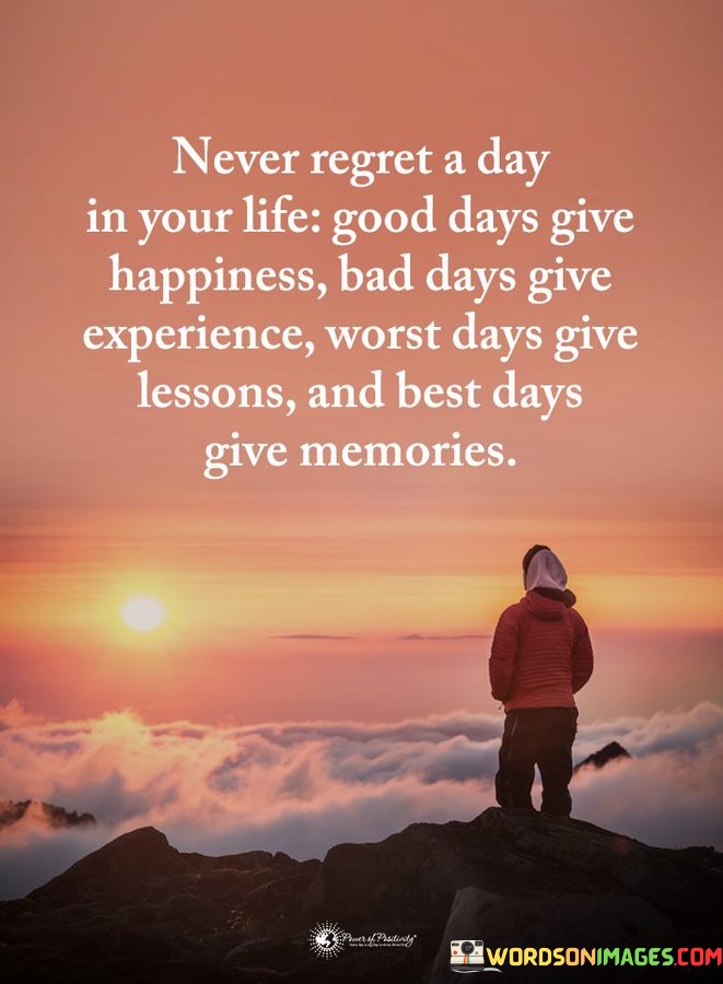 This quote encourages a positive and reflective outlook on life. It advises against regretting any day because each day offers valuable experiences and lessons. "Good days give happiness" reminds us to cherish the joyful moments and appreciate the positive aspects of life.