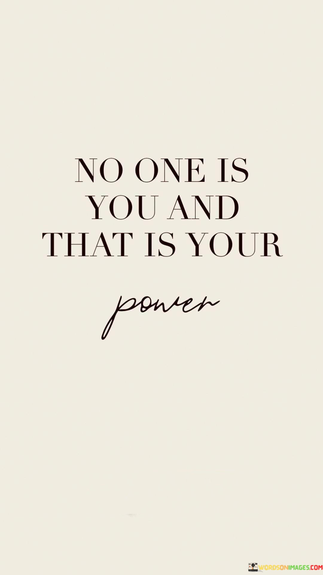 Furthermore, the quote implies that your uniqueness is your power. Your experiences, talents, and perspectives are unlike anyone else's, and they shape your identity. By recognizing and embracing your individuality, you can tap into your full potential and make a positive impact in your own way. It reminds us that we don't need to imitate others or conform to societal expectations to find success or happiness. Instead, we should celebrate what makes us different and use it as a source of strength.
