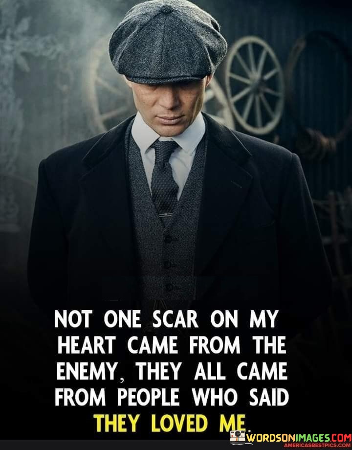 The quote emphasizes the unexpected sources of emotional wounds. "Scar on my heart" symbolizes emotional pain. "Came from people who said they loved me" highlights the contrast between words and actions. The quote conveys the hurt caused by those who claimed to care.