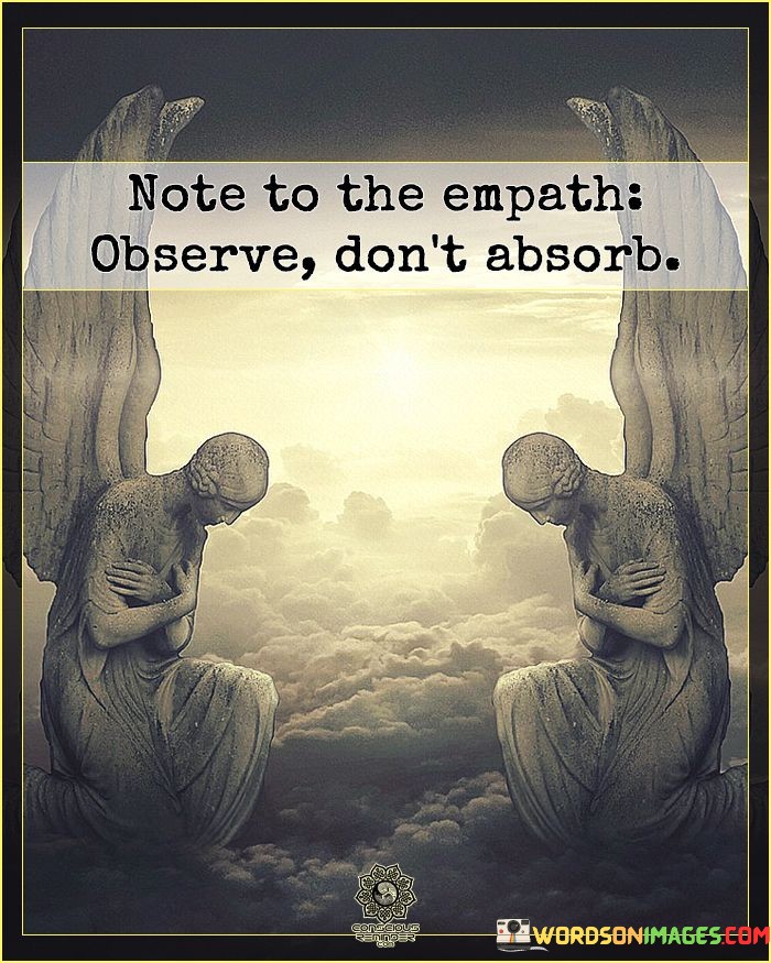The quote offers guidance to empaths, individuals who are highly sensitive to others' emotions. It advises them to observe the emotions and energies around them without absorbing or taking them on personally. This self-preservation technique helps empaths maintain emotional boundaries and prevent being overwhelmed by the feelings of others.