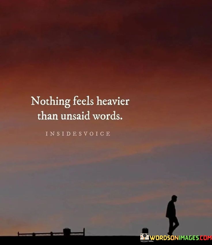 When we hold back our thoughts and feelings, they can accumulate within us, causing emotional distress and turmoil. This quote implies that the heaviness of these unspoken words can be overwhelming, often leading to inner conflict, stress, and a sense of unease. It underscores the importance of open and honest communication to alleviate this emotional burden.
