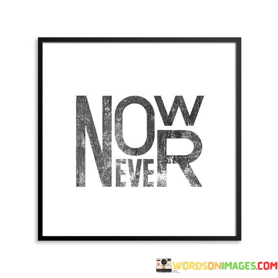 "Now" represents the current moment, and "Never" implies a state of eternal absence or the loss of an opportunity. This quote serves as a reminder that the present is a valuable and fleeting moment in which we can take action, make choices, and pursue our goals. It suggests that waiting for a more convenient or perfect time may result in missed chances.