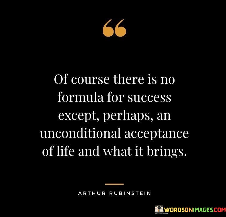 This quote suggests that while there may not be a specific or guaranteed formula for achieving success, one essential element for navigating life's challenges is to unconditionally accept what life brings. It emphasizes the importance of embracing life's unpredictability and being adaptable in the face of various circumstances.