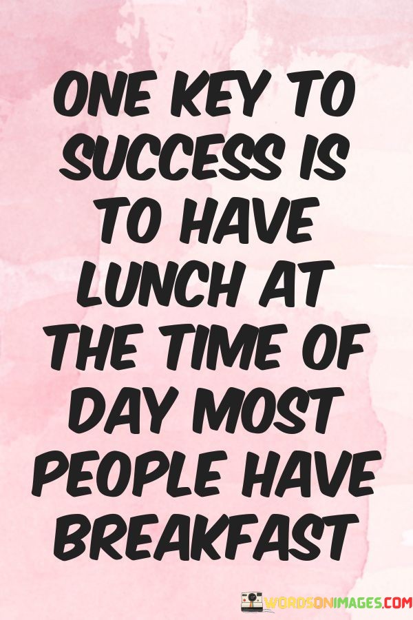 The statement "One Key To Success Is To Have Lunch At The Time Of Day Most People Have Breakfast" suggests that success can be achieved by adopting unique and unconventional strategies. It implies that thinking outside the box and making unconventional choices can set individuals apart and contribute to their accomplishments.