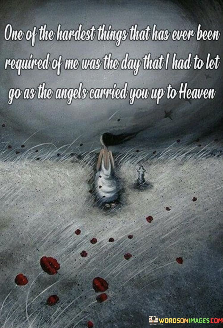 The quote conveys the profound difficulty of saying goodbye to a loved one. "Hardest things" implies immense emotional challenge. "Angels carried you up to heaven" signifies the loss of a dear person. The quote captures the heart-wrenching experience of letting go as a loved one passes away.