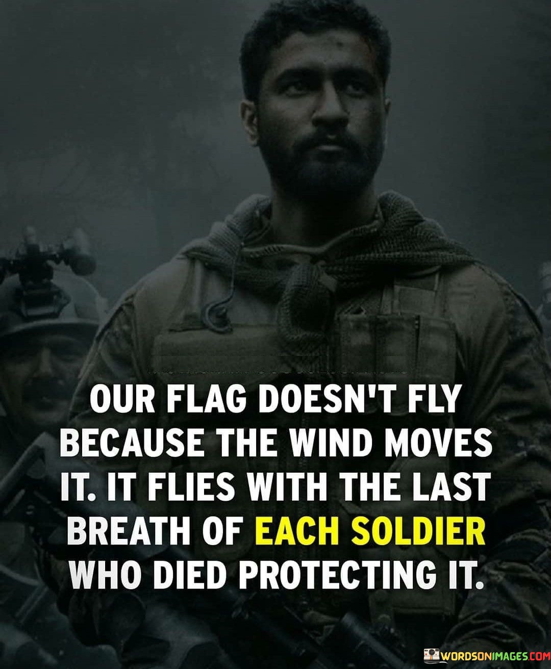 The metaphorical comparison of the flag to the breath of fallen soldiers emphasizes the deep connection between the flag and the ultimate sacrifices made by military personnel. The quote suggests that the flag's resilience and steadfastness are rooted in the unwavering commitment and bravery of those who have laid down their lives to protect the values it stands for.