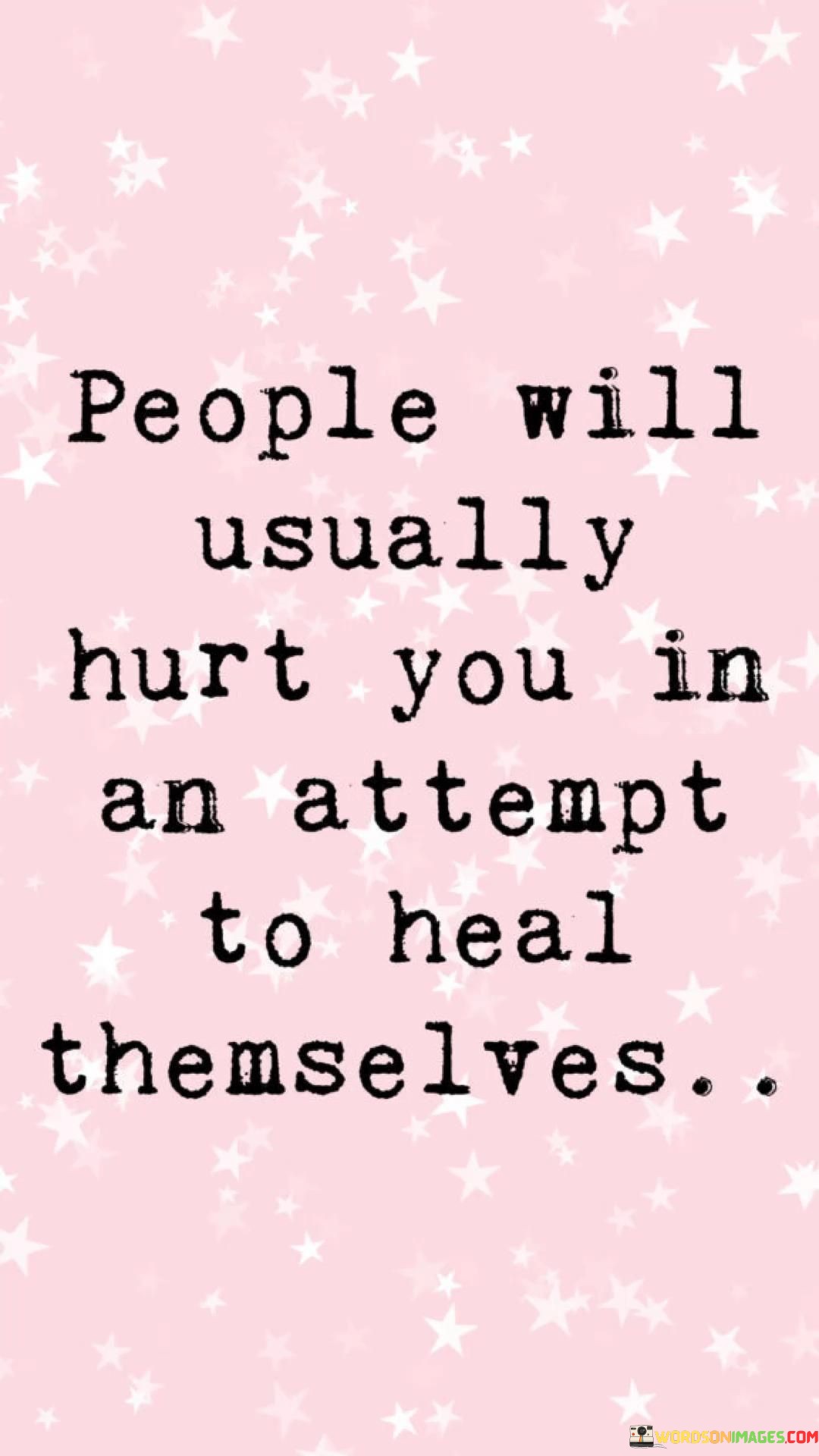 This quote highlights a complex aspect of human behavior. It suggests that individuals may unintentionally hurt others when they are trying to heal themselves. This can occur when someone is grappling with their own emotional wounds, and in their efforts to find solace or relief, they may inadvertently harm those around them.