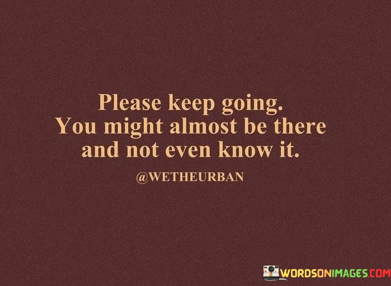 "Please Keep Going, You Might Almost Be There And Not Even Know It" is a motivational reminder that success could be closer than it seems. It encourages perseverance during challenging times by emphasizing that progress may be hidden, yet significant progress is being made. This quote suggests that pushing forward despite uncertainty can lead to unexpected breakthroughs.