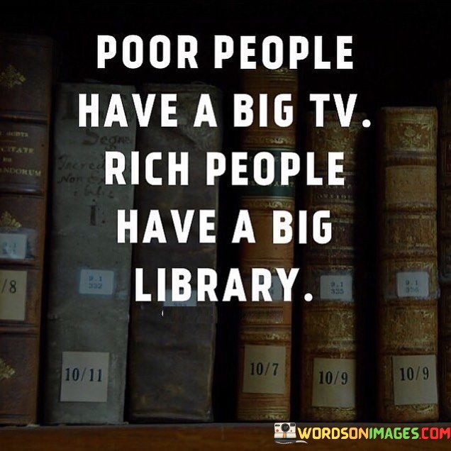 The quote "Poor people have a big TV, rich people have a big library" highlights the contrast in priorities and spending habits between individuals with different financial mindsets. In this context, the term "poor people" refers to those who may not have significant financial resources, while "rich people" refers to those who are financially prosperous and have accumulated wealth. The quote suggests that people with limited financial means may prioritize immediate gratification and material possessions, such as a big TV, which can provide entertainment and distraction. On the other hand, wealthy individuals are portrayed as valuing knowledge and self-improvement, as evidenced by their investment in building a vast library. Having a big TV may symbolize a focus on leisure and entertainment, which can be enjoyable but may not necessarily contribute significantly to personal growth or long-term success. It can represent a preference for instant gratification and passive consumption of content. In contrast, having a big library symbolizes a commitment to education, learning, and self-development. Books are a valuable source of knowledge, and building a library reflects a desire to continually expand one's understanding of the world and acquire new skills. The quote does not imply that owning a TV is inherently negative or that wealthy individuals do not enjoy leisure activities. Instead, it underscores the importance of balancing immediate pleasures with long-term investments in self-improvement and education. Furthermore, the quote suggests that wealth is not solely determined by material possessions but also by the mindset and habits of individuals. Building a library and investing in knowledge can lead to personal growth, critical thinking, and the ability to make informed decisions, which are essential attributes for achieving financial success and prosperity. In conclusion, the quote "Poor people have a big TV, rich people have a big library" contrasts the spending habits and priorities of individuals with different financial mindsets. It encourages a focus on self-improvement, education, and the value of knowledge as a means to achieve long-term success and prosperity. Ultimately, wealth is not only measured by material possessions but also by the willingness to invest in one's personal growth and continuous learning.