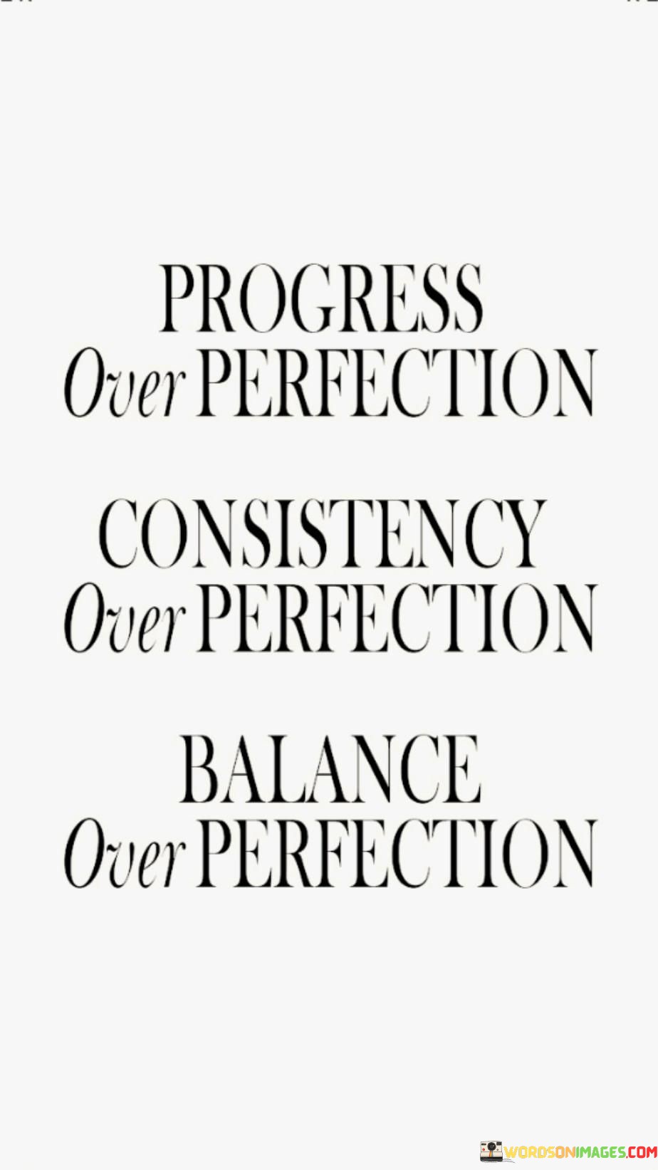 "Progress Over Perfection, Consistency Over Perfection, Balance Over Perfection" encapsulates a valuable mindset for personal development and success. It emphasizes prioritizing gradual advancement, steady commitment, and a harmonious approach instead of fixating on unattainable perfection.