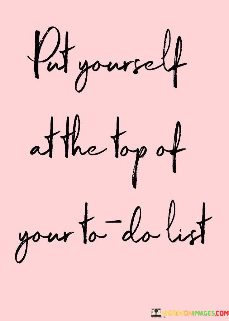 "Put Yourself at the Top of Your To-Do List" is a powerful reminder to prioritize self-care and self-love in our daily lives. It's like a gentle nudge to recognize that taking care of ourselves is not selfish but essential for our well-being. This affirmation encourages us to place our physical and emotional needs at the forefront of our responsibilities.