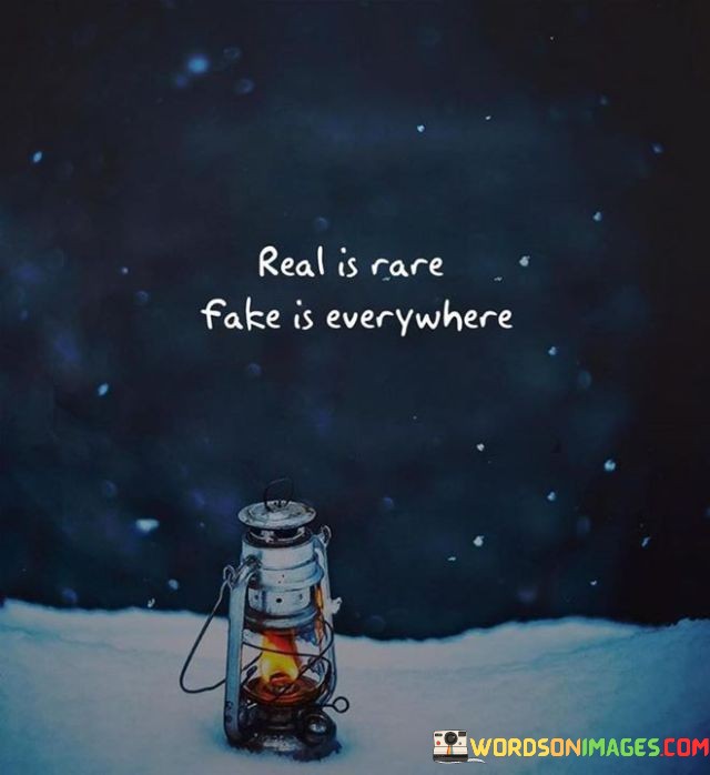 Overall, this quote encourages us to appreciate and cultivate authenticity in ourselves and in our interactions with others. It serves as a reminder that true connections and genuine emotions are treasures worth seeking and nurturing. By acknowledging the scarcity of authenticity and the abundance of pretense, the quote prompts us to be more conscious of our own behavior and choices, striving to be among the "rare" and authentic individuals in a world saturated with the "everywhere" of fakeness.