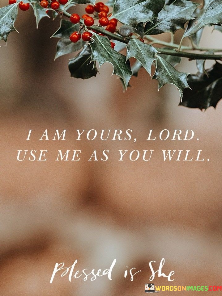 This statement conveys surrender to a higher power. It's like offering oneself as an instrument of divine will. "I am yours, Lord" signifies submission to a greater purpose. It's like being a vessel ready to carry out God's plan, symbolizing faith and humility.