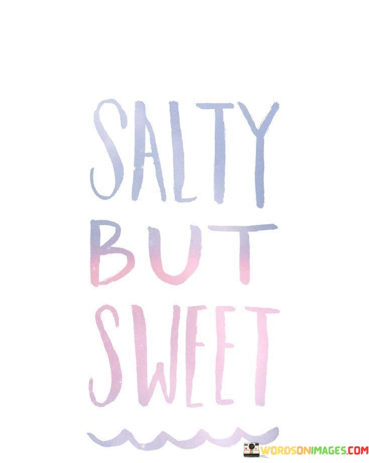 The quote "Salty but sweet" succinctly describes a combination of flavors or qualities that might seem contradictory but can be surprisingly enjoyable when experienced together.