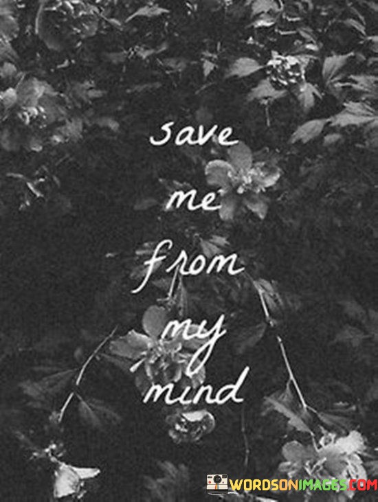 The quote captures the notion that our minds can sometimes become our own battleground. Inner struggles, worries, and doubts can become a cycle that's hard to break free from. "Save me from my mind" encapsulates the desire for a reprieve, a chance to escape the relentless loop of negative or distressing thoughts.