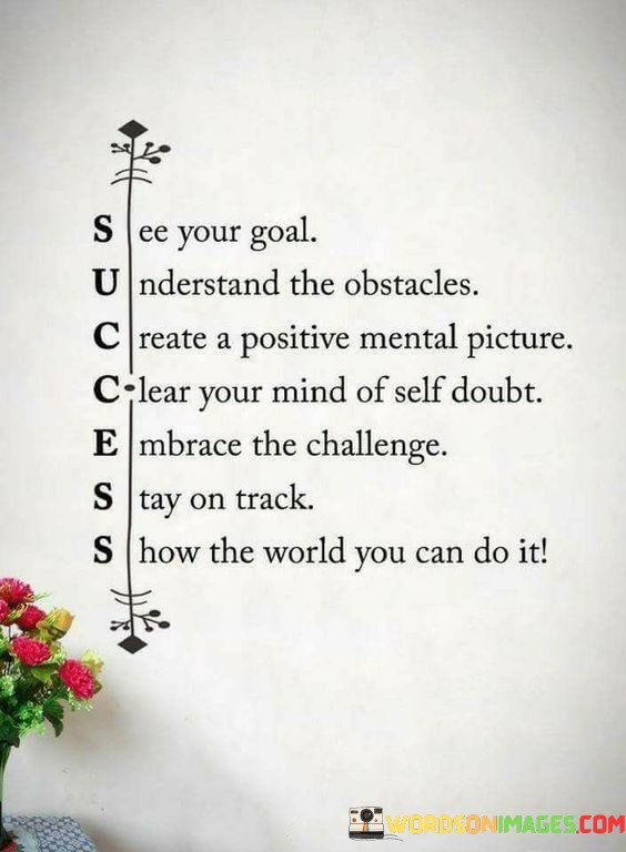 Certainly! You've provided a set of instructions for achieving a goal. Here's a summary:See Your Goal: Visualize your objective clearly. Having a clear image of your goal sets the foundation for your journey.Understand The Obstacles: Identify potential challenges. Understanding obstacles helps you prepare and plan effectively.Create A Positive Mental Picture: Cultivate a positive mindset. Envisioning success breeds confidence and motivation.Clear Your Mind of Self-Doubt: Banish self-doubt. Believing in your abilities is crucial for progress.Embrace The Challenge: Challenges are opportunities for growth. Embrace them as stepping stones to success.Stay on Track: Maintain focus and discipline. Consistency is key to turning your vision into reality.Show the World You Can Do It: Use your actions to prove your capabilities. Demonstrating your determination inspires others.