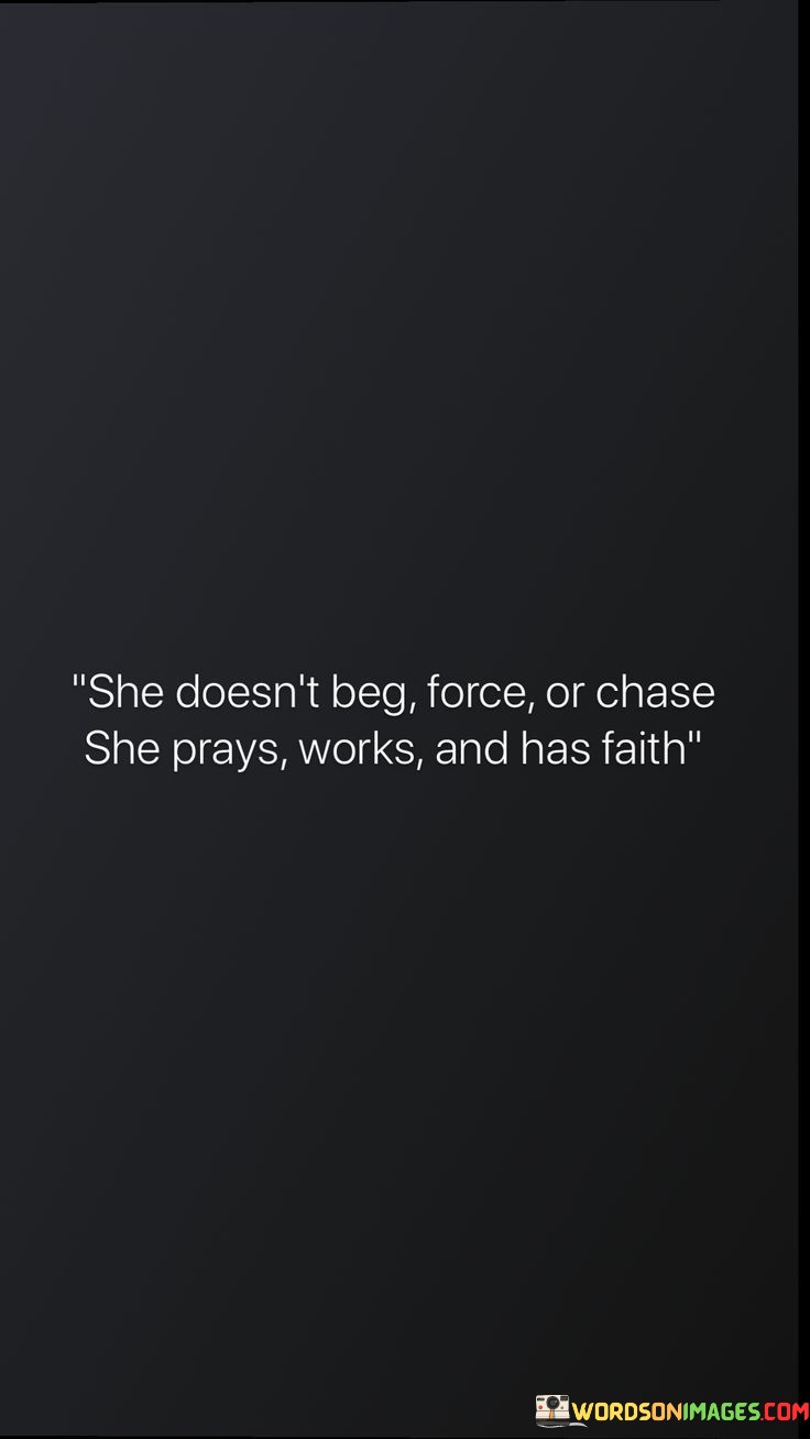 This quote speaks to a powerful and transformative mindset, highlighting the woman's approach to achieving her desires and aspirations. It conveys that she does not resort to begging, forcing, or chasing after what she wants. Instead, she chooses to rely on prayer, hard work, and unwavering faith. The quote suggests a sense of self-assuredness and confidence, as the woman recognizes her own worth and refuses to compromise her dignity by begging for anything. Instead, she turns to prayer, seeking guidance, strength, and clarity from a higher power. Alongside her prayers, she combines her faith with diligent effort and hard work, understanding that dreams are not realized through mere wishes, but require dedicated action. This quote embodies a belief in the power of divine intervention, the importance of personal agency, and the transformative effect of faith. By embracing this mindset, the woman demonstrates a steadfast commitment to her goals and a trust that, through her actions and faith, she can manifest her desires. It conveys a message of empowerment and resilience, reminding us to align our intentions, efforts, and beliefs as we strive towards our own aspirations.