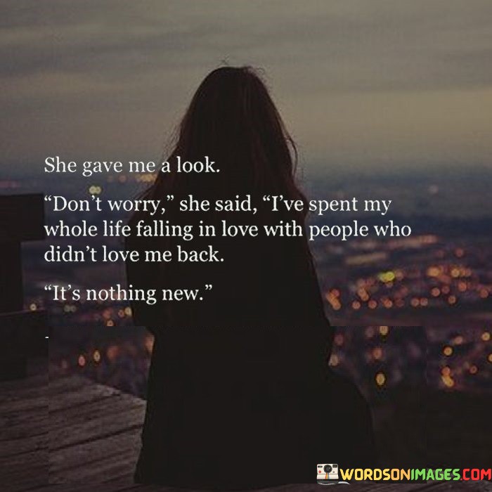 This poignant quote portrays a moment of understanding and empathy between two individuals, where one person shares her experience of unrequited love with another. The phrase "she gave me a look" suggests a shared connection between the speaker and the person they are confiding in. As the speaker shares her vulnerability, she conveys her resilience in the face of past heartbreaks. The line "don't worry she said" portrays the comforting and supportive response of the listener, indicating their willingness to be a source of solace and understanding. The phrase "I've spent my whole life falling in love with people who didn't love me back" reveals the speaker's pattern of experiencing unreciprocated affection, possibly implying a cycle of emotional challenges she has endured throughout her life. The statement "it's nothing new" conveys a sense of acceptance and a recognition that unrequited love is a familiar experience for her. This quote serves as a powerful testament to the universality of human emotions, particularly the pain and disappointment that can accompany unrequited love. It speaks to the resilience and strength that can be found within individuals who have navigated love's complexities, showing the power of empathy and shared experiences to foster connection and support between people. The quote also emphasizes the significance of having someone to confide in, who can offer a compassionate ear and a non-judgmental presence during moments of emotional vulnerability. Ultimately, it serves as a reminder of the beauty of human connection, understanding, and empathy in the face of life's emotional challenges.