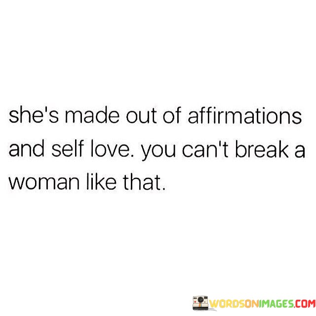 The quote "She's made out of affirmations and self-love; you can't break a woman like that" embodies the immense strength, resilience, and inner power of a woman who has cultivated a deep sense of self-acceptance and self-worth. It conveys the idea that a woman who has embraced affirmations and nurtured self-love is unshakeable and cannot be easily broken or undermined.