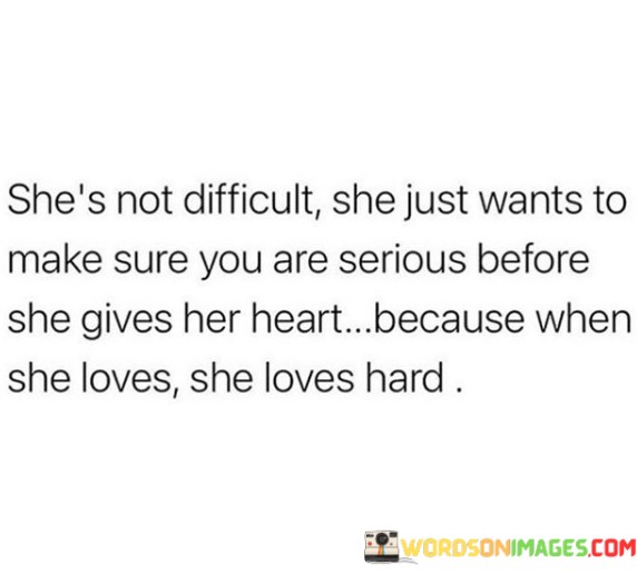This quote beautifully captures the essence of a woman who may be perceived as challenging or guarded in matters of the heart. It emphasizes that her apparent difficulty or cautious approach is not due to being unkind or uninterested; rather, it stems from a place of self-respect and a desire to protect her heart from potential hurt. This woman values genuine and committed connections, and she seeks assurance that the person pursuing her is sincere and devoted before she opens up emotionally.