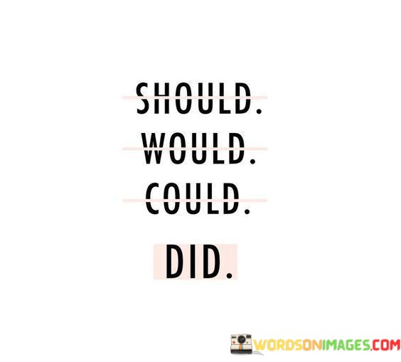 These four words capture phases of decision-making and action. "Should" indicates possibilities, implying what might be advisable. "Would" signifies intentions, hinting at what one might do. "Could" encompasses potentials, illustrating what's achievable. "Did" denotes realization, indicating action taken and results achieved.