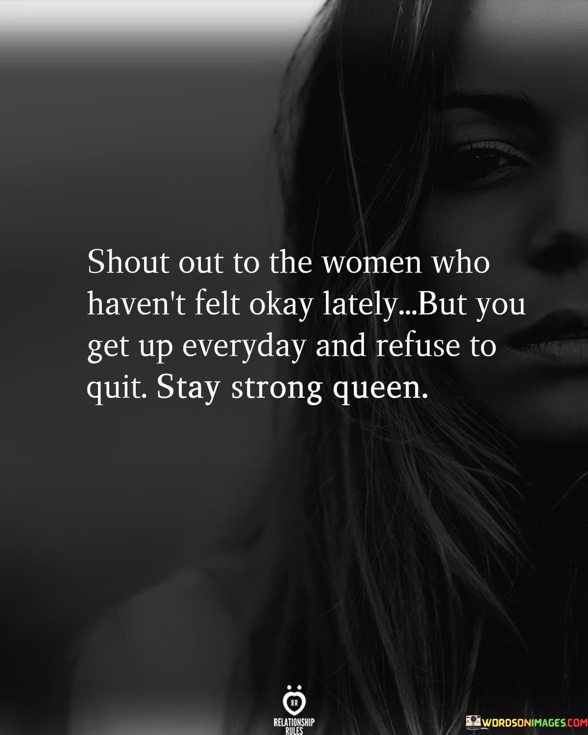 "Shout Out to the Women Who Haven't Felt Okay Lately" recognizes the struggles and emotional hardships that some women may be facing. It acknowledges that it's okay not to feel okay and validates their feelings of vulnerability and unease.