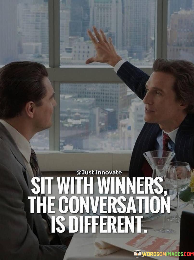 The quote underscores the influence of one's social circle. It implies that being in the company of winners can elevate the quality and substance of conversations.
