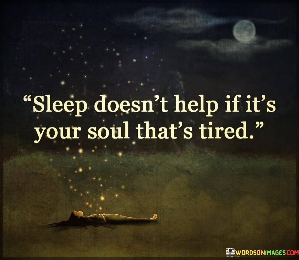 The quote "sleep doesn't help if it's your soul that's tired" highlights the significance of emotional and spiritual well-being. While physical rest is important, it cannot alleviate the fatigue of a weary soul. This emphasizes the deeper importance of addressing inner struggles and nurturing one's emotional health for holistic rejuvenation.