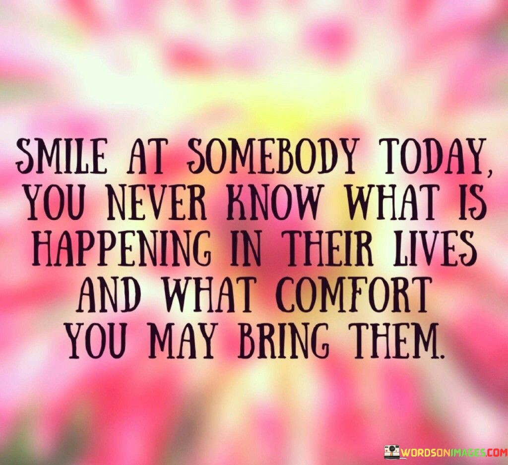 "Smile at somebody today. You never know what is happening in their lives and what comfort you may bring them back." This quote underscores the power of a simple smile to make a positive impact on someone's day and emotional well-being.