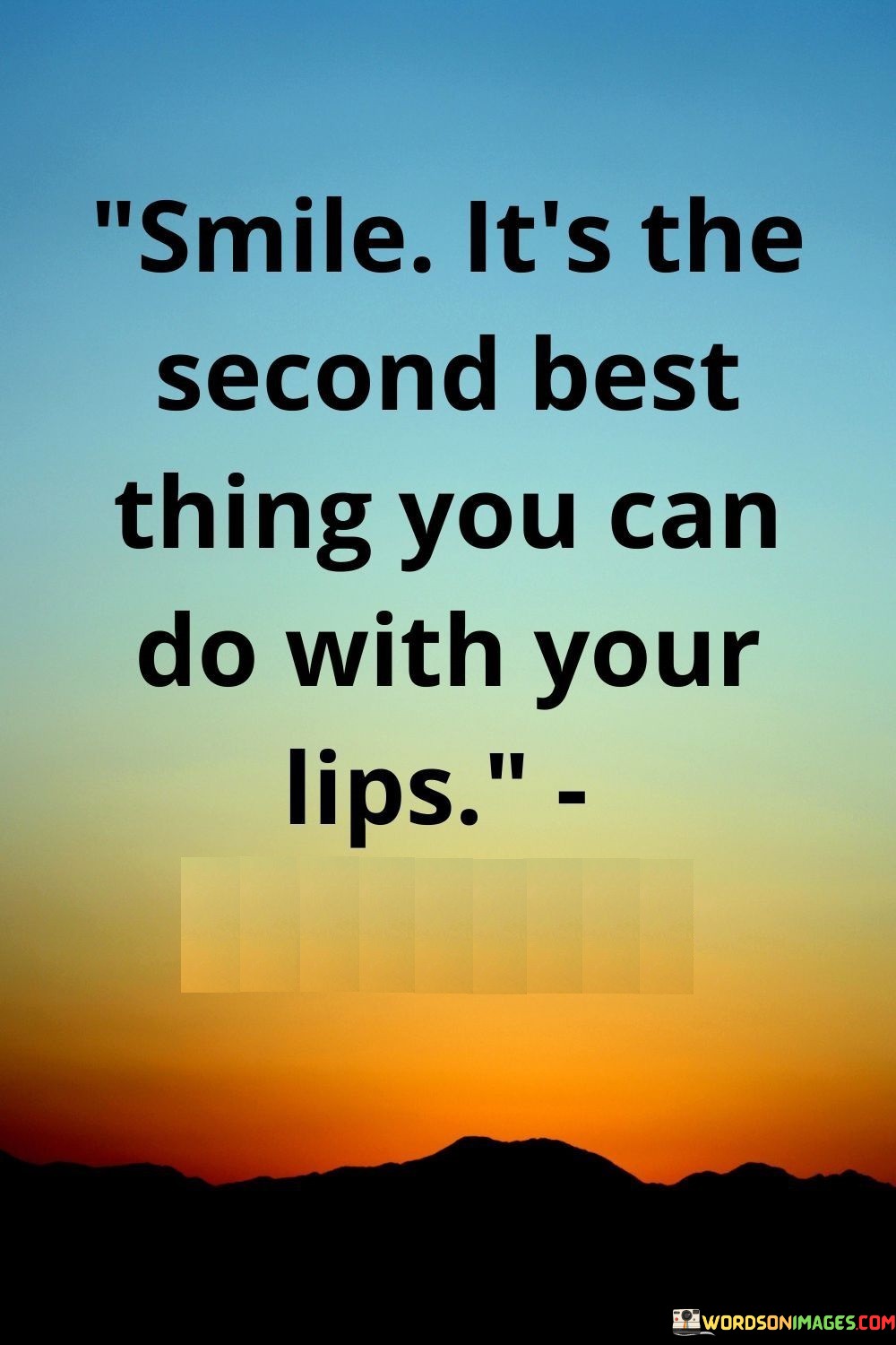 The quote playfully suggests the value of a smile. "Smile, it's the second best thing you can do with your lips" implies that a smile is a positive and joyful expression that ranks closely behind a kiss in terms of its impact.