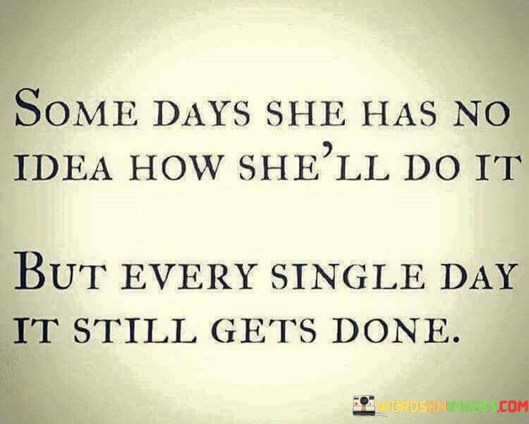 This quote beautifully captures the resilient and determined spirit of a person facing life's challenges. It describes an individual, likely a woman, who confronts her daily responsibilities with unwavering resolve, even when she feels overwhelmed and unsure about how to tackle them. The phrase "some days she has no idea how she'll do it" illustrates the moments of doubt and uncertainty that everyone experiences. Despite these doubts, the quote emphasizes the person's remarkable tenacity as it declares that "every single day it still gets done."