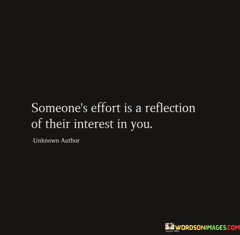 Effort speaks volumes. The quote alludes to communication through actions. It's about unspoken messages. The speaker implies that actions often speak louder than words, promoting the concept that by paying attention to the effort someone puts in, one can gain insight into their feelings and intentions, highlighting the importance of looking beyond words to truly understand someone's interest.