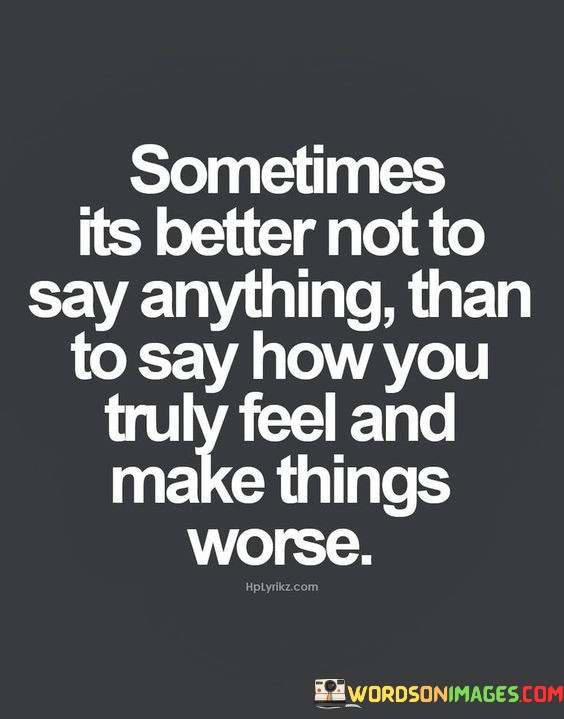 The quote advocates for cautious communication. "Better not to say anything" signifies restraint. "Say how you truly feel and make things worse" implies potential conflict. The quote conveys the wisdom of silence when expressing genuine emotions might escalate a situation.