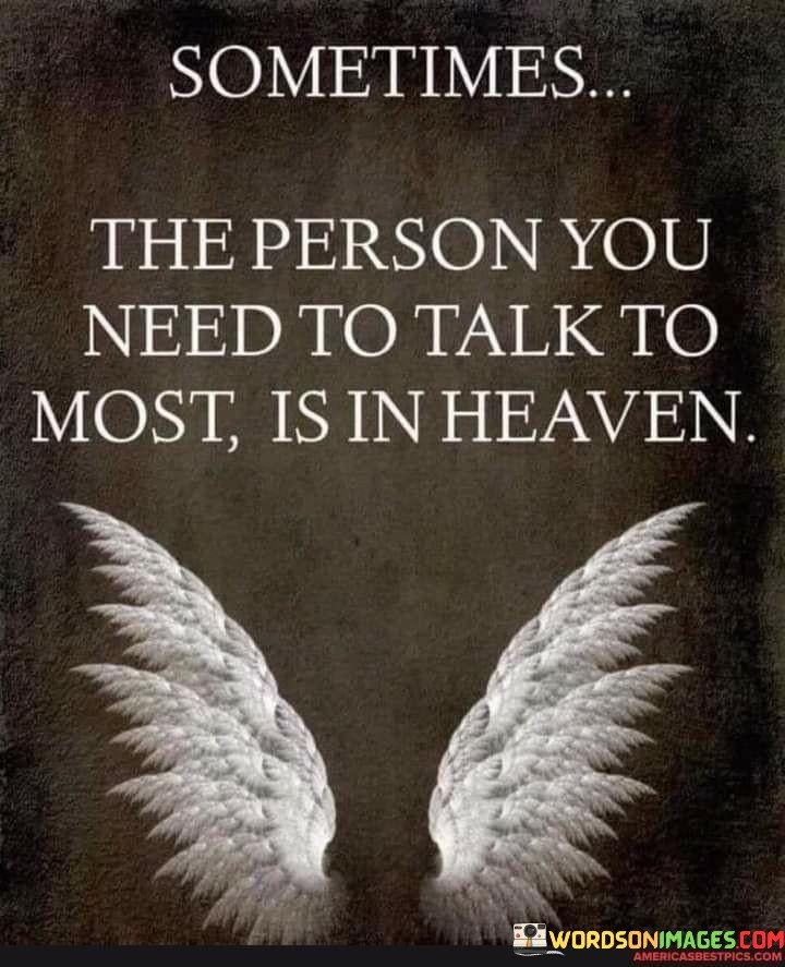 The quote reflects on the absence of a loved one. "Person you need to talk to most" signifies emotional support. "In heaven" alludes to their passing. The quote conveys the longing to connect with someone who has passed away, emphasizing the emotional void.