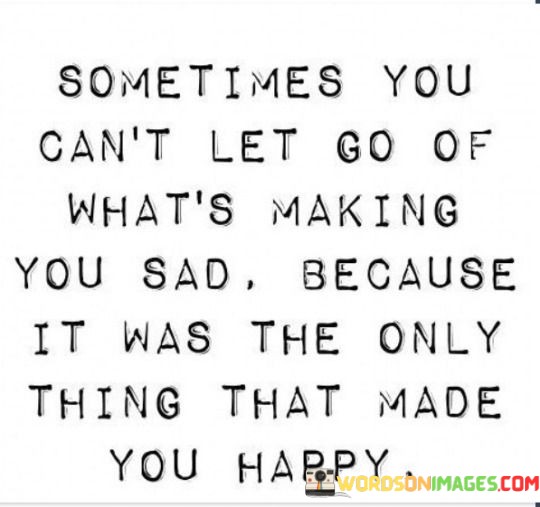The quote "Sometimes you can't let go of what's making you sad because it was the only thing that made you happy" captures the paradoxical nature of holding onto something that brings both sadness and happiness.