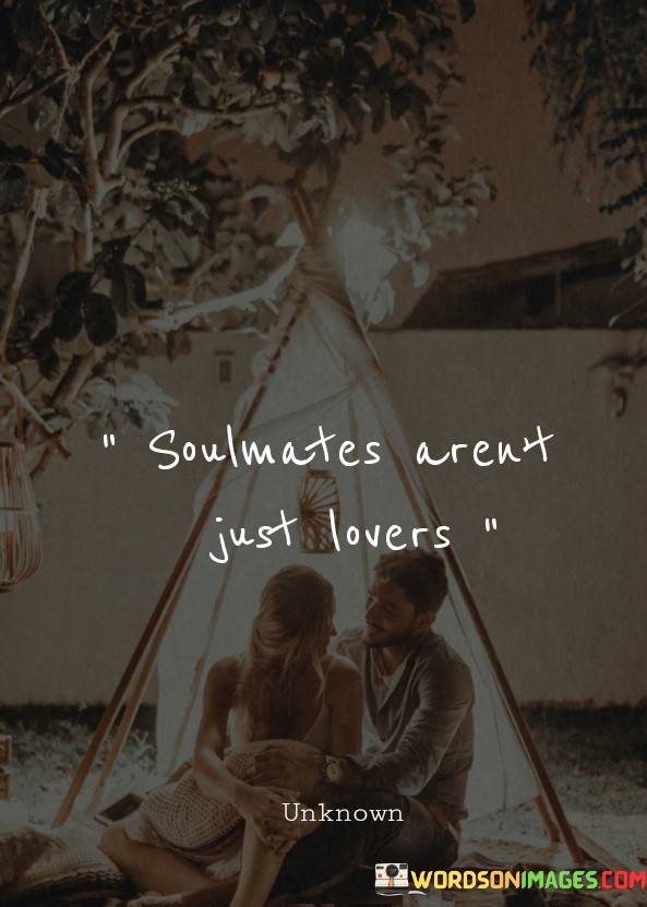 Soulmates are more than just romantic partners. This quote highlights that a soulmate connection goes beyond the realm of lovers. A soulmate can be a friend, a mentor, a family member, or anyone with whom you share a deep and profound bond. It's a connection that transcends the physical and romantic aspects of a relationship.