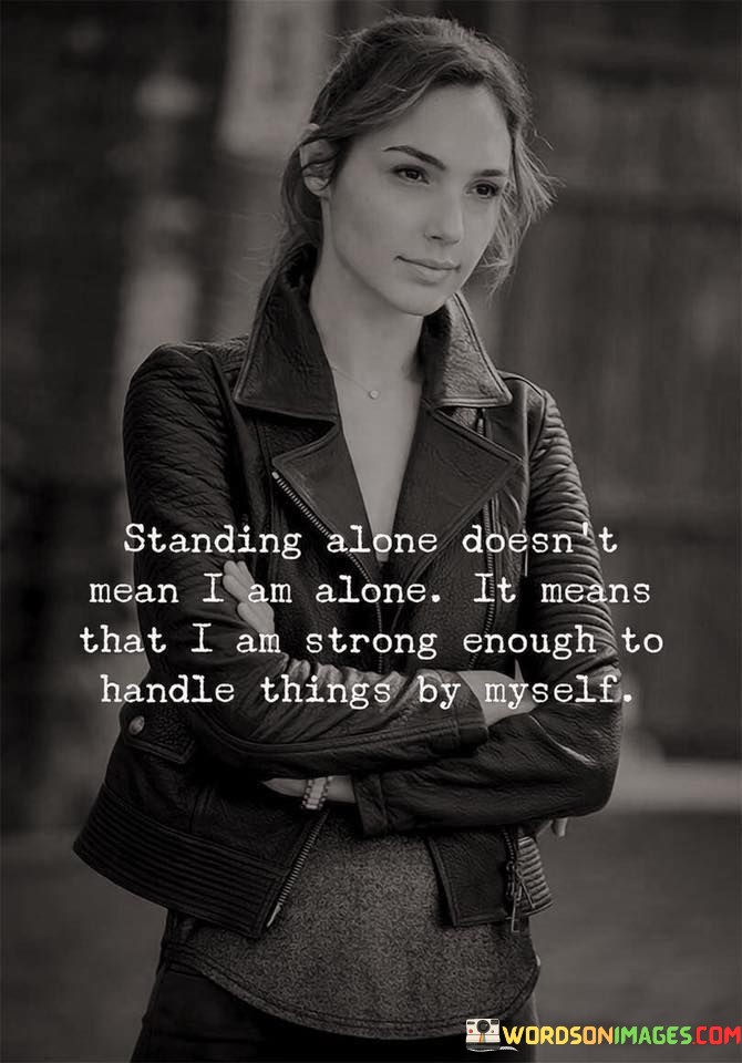 The quote "Standing alone doesn't mean I am alone; it means that I am strong enough to handle things by myself" conveys the idea that being independent and self-reliant does not equate to loneliness or weakness. It suggests that the ability to stand alone demonstrates inner strength and resilience, indicating that one possesses the confidence and capability to face challenges and navigate life's difficulties without relying heavily on others. The quote challenges the notion that relying on others for support or companionship is a sign of strength, emphasizing that true strength lies in one's ability to handle and overcome obstacles independently. It underscores the importance of self-sufficiency and self-empowerment, highlighting the capacity to take control of one's own life and make decisions with confidence. Standing alone signifies a sense of self-assuredness and self-reliance, demonstrating that one possesses the inner resources necessary to confront and manage various circumstances. This quote encourages individuals to embrace their independence, recognizing that being able to handle things on their own is a testament to their inner strength. It challenges societal expectations that equate strength with constant reliance on others and instead celebrates the power of personal resilience and self-determination. It serves as a reminder that being alone does not equate to weakness or isolation but rather signifies the inner fortitude and capability to navigate life's challenges with self-assurance.