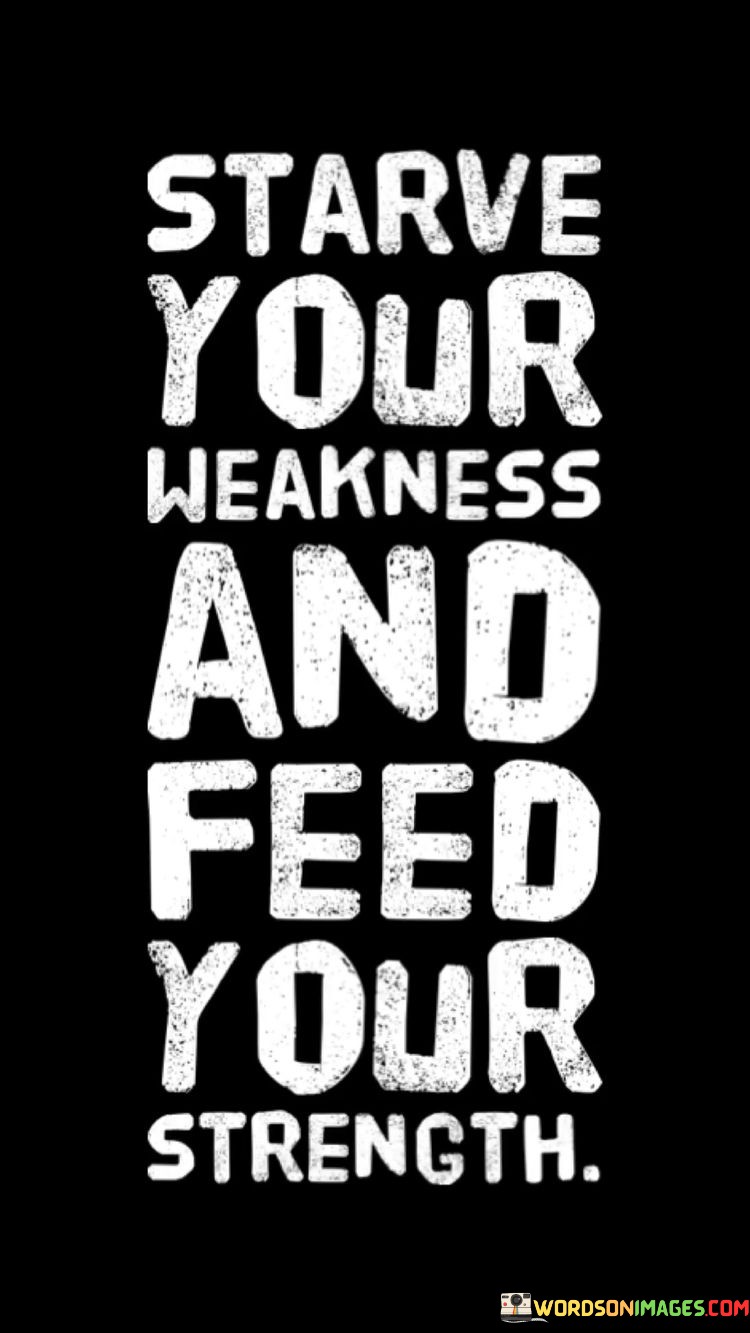 The quote "Starve your weakness and feed your strength" carries a powerful message about personal growth and self-improvement. It suggests that individuals should focus their time, energy, and attention on nurturing their strengths and talents while minimizing the influence of their weaknesses and shortcomings.