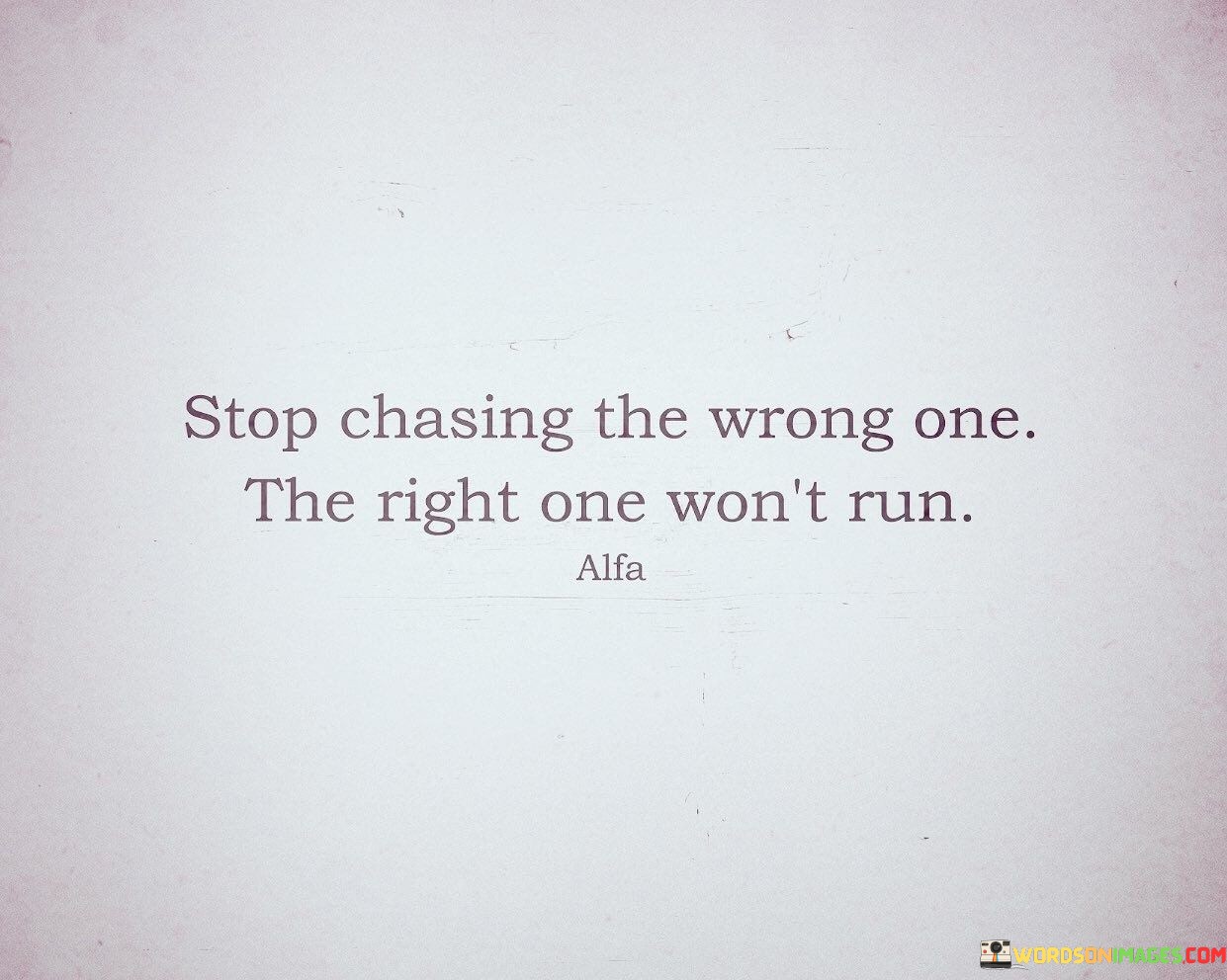 Cease pursuing the person who is not meant for you, because the one who is truly right for you will not try to evade or escape. This quote conveys a valuable lesson about relationships and love. It suggests that it's essential to recognize when you are investing time and energy into someone who may not reciprocate your feelings or intentions.
